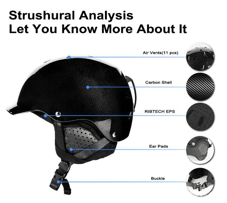 Carbon SheII + RIBTECH + EPS high-quality materials, With the bonding process EPS integrated press rubber molding design; High-intensity carbon fiber, organic fiber, Multiaxial long fiber, Twill carbon fiber composition; Porous adjustable ventilation system (cold air intake and heat emission), Accelerate the heat gas discharge; Outer / inner seam fan sandwich mesh, Keep warm while keeping breathable, dry and comfortable; Suede sports grade material, Ensure wearer comfort, Inside the detachable ear pads, Humanized design of removable velvet cotton lining insulation layer, ear pad, Convenient for cleaning; A dial-type 360-degree adjustable knob on the back of the helmet, Easy to adjust and tighten the overall head circumference fit, Cycling is more comfortable to wear; Ski mirror elastic band fixing bracket, Suitable for different specifications of ski mirror fixation; The smooth appearance and strip hole design is fashionable, beautiful, safe and useless.